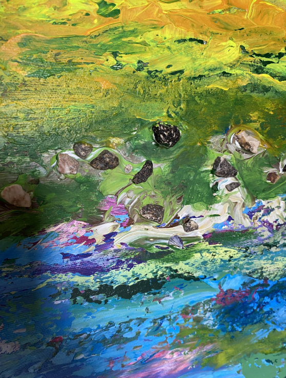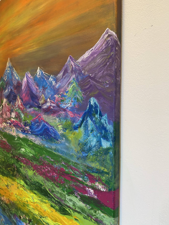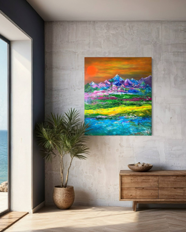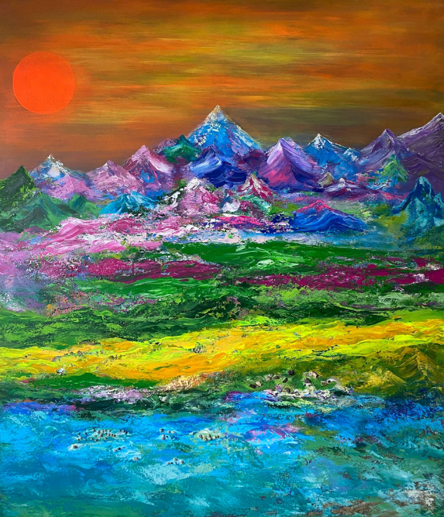 Light of a New Day is a piece into which I've poured my personal memories and experiences. I used layers of acrylic paint, working with both brush and palette knife to create depth and rich texture. The dominant element is a vibrant orange sun, radiating strong energy throughout the piece. I incorp...