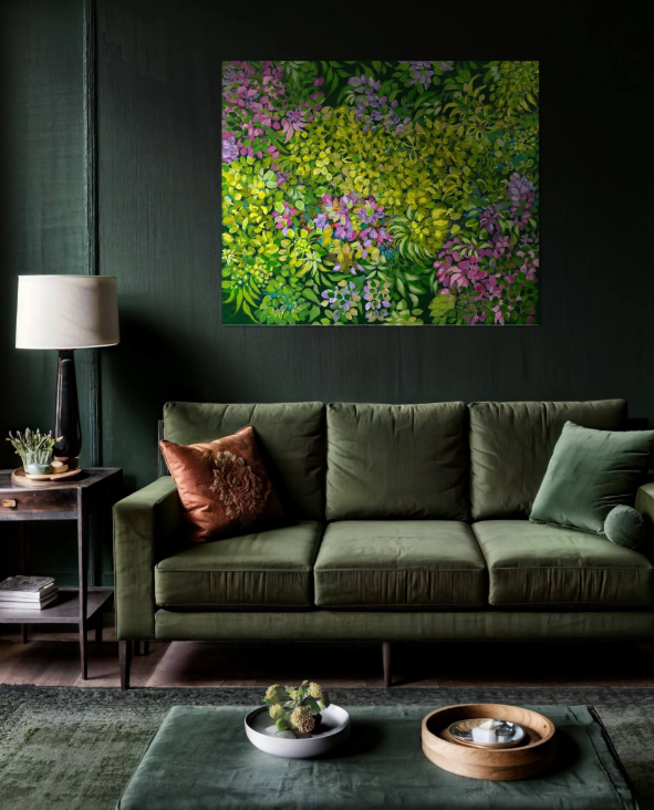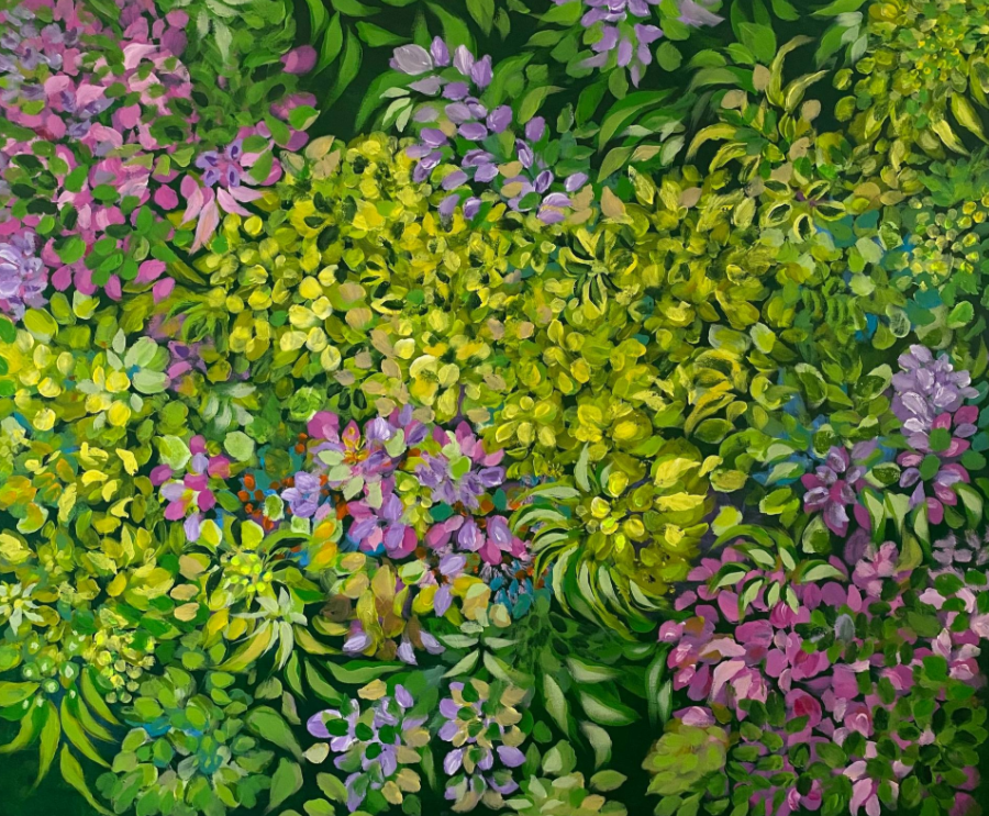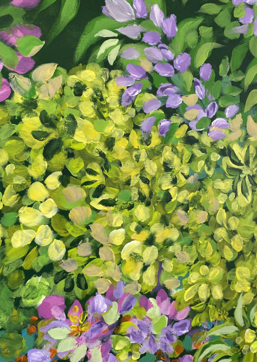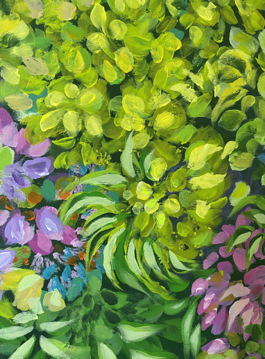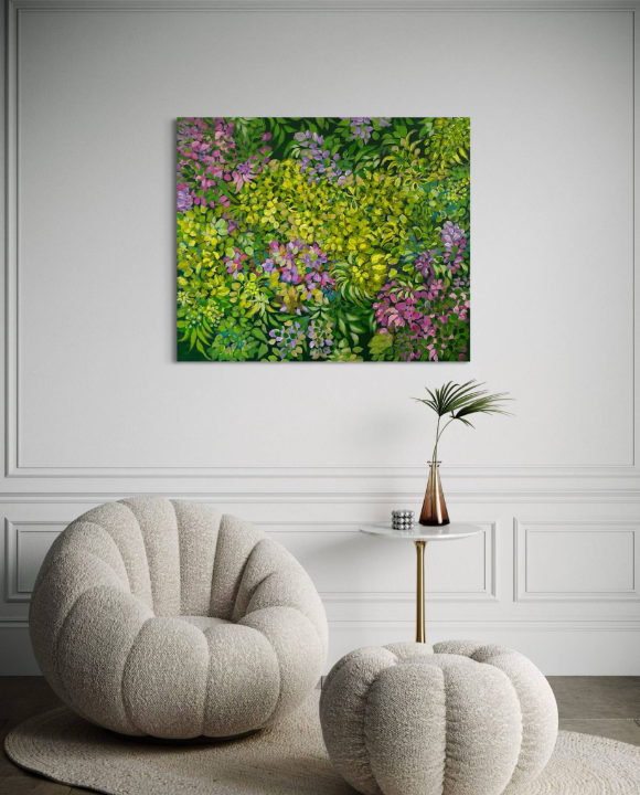 An abstract painting inspired by the colors of nature in summer. It combines shades of green, yellow, and purple with loose, layered brushstrokes. The composition is full of light and movement, without aiming to represent anything exactly—just a feeling of warmth and harmony.